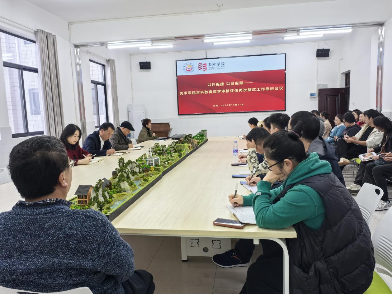 为深入贯彻落实本科教育教学审核评估工作要求,进一步推进学院评建整改工作,2025年10月31日下午3时,美术学院在411会议室组织召开了“以评促建,以改促强——本科教育教学审核评估再次整改工作推进会”。学院党委书记田建林,党委副书记、院长李婷婷,党委副书记温志波,副院长龙社勤及全院教职工参加了会议。会议由龙社勤副院长主持。