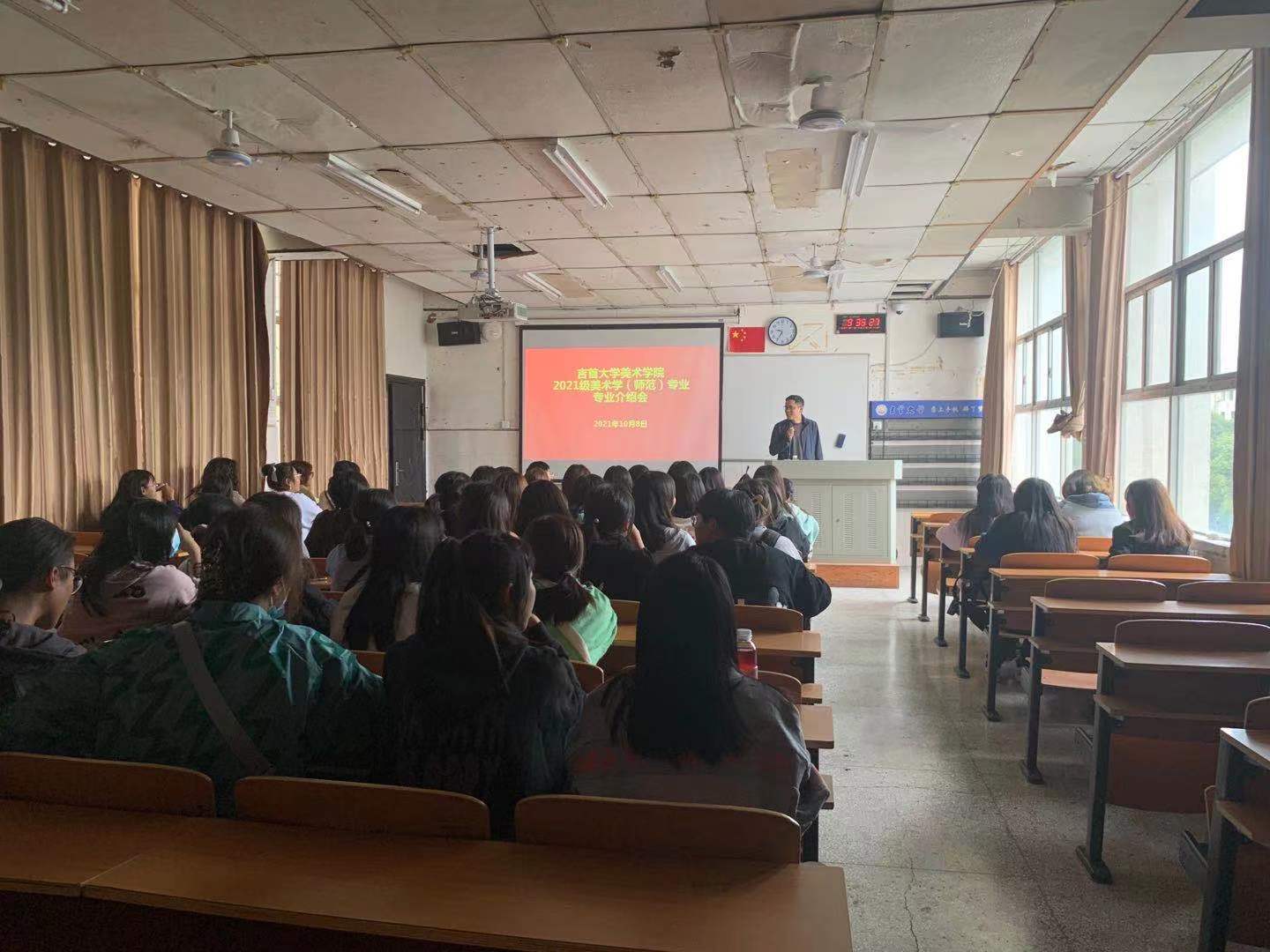 大会上,吴工老师首先以昂扬自信的话语将我院美术学专业的独特优势、美术学美育“化人”、“成人”的专业作用娓娓道来,将我院美术学专业因材施教、美术学专业育人育才成果,在2021级新生面前如水墨画般缓缓铺展开来,将整场专业大会烘托出具有美术学专特特色的美育氛围。